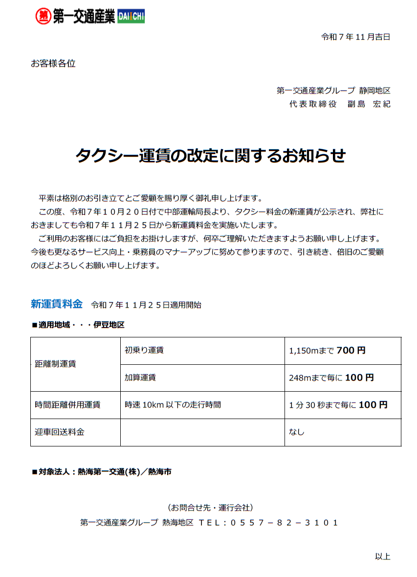 【熱海エリア】タクシー運賃の改定に関するお知らせ 公開日: 2025年11月10日更新日: 2025年11月10日著者: daiichi-kotsuカテゴリー: 静岡エリア 関連記事 【沼津エリア】タクシー運賃の改定に関するお知らせ 公開日: 2025年11月10日更新日: 2025年11月10日著者: daiichi-kotsuカテゴリー: 静岡エリア 【富士宮エリア】タクシー運賃の改定に関するお知らせ 公開日: 2025年11月10日更新日: 2025年11月10日著者: daiichi-kotsuカテゴリー: 静岡エリア 【静岡エリア】ホームページを開設しました この度、「第一交通グループ 静岡エリア」のホームページを開設しました。 URLは、下記になります。 https://shizuoka.0152.jp/ 今後とも、どうぞよろしくお願いいたします。 公開日: 2025年7月28日更新日: 2025年7月28日著者: 第一交通カテゴリー: 静岡エリア