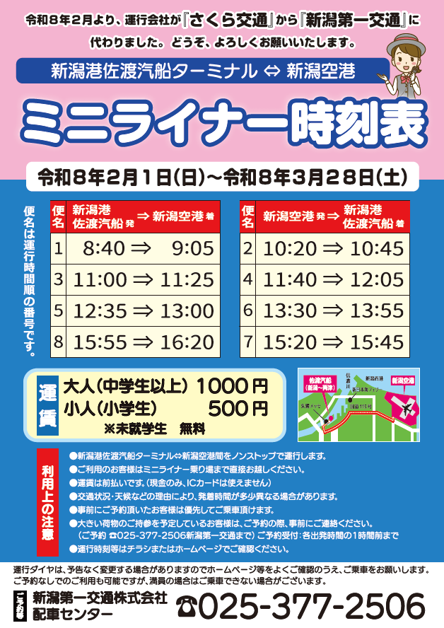 03 新潟空港から瀬波温泉を結ぶ直行便「新潟空港・瀬波温泉ミニライナー」を運行開始致します 公開日: 2026年2月3日更新日: 2026年2月12日著者: daiichi-kotsuカテゴリー: 新潟エリア