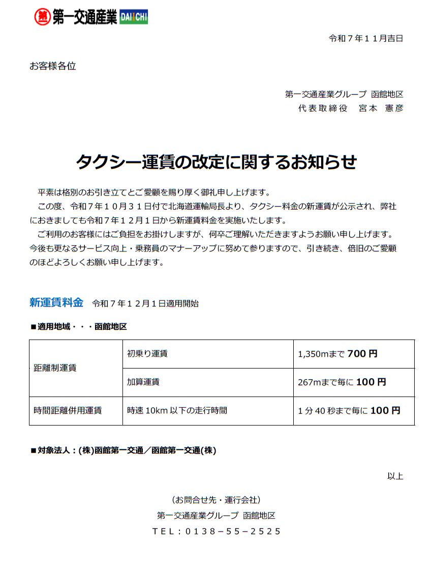 【函館エリア】タクシー運賃の改定に関するお知らせ 公開日: 2025年11月28日更新日: 2025年11月28日著者: daiichi-kotsuカテゴリー: 函館エリア 関連記事 【函館エリア】ホームページを開設しました この度、「第一交通グループ 函館エリア」のホームページを開設しました。 URLは、下記になります。 http://kotobuki.0152.jp/ 今後とも、どうぞよろしくお願いいたします。 公開日: 2022年10月4日更新日: 2025年11月28日著者: daiichi-kotsuカテゴリー: 函館エリア