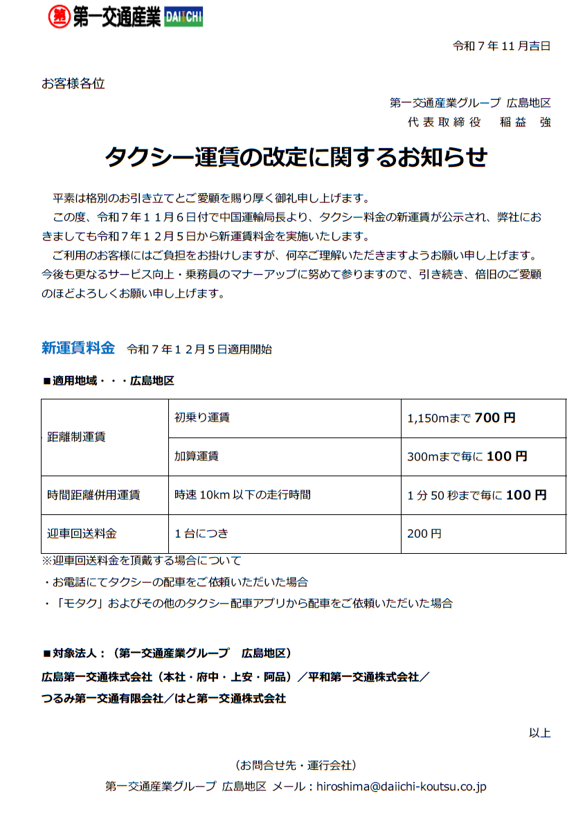 【広島エリア】タクシー運賃の改定に関するお知らせ 公開日: 2025年11月10日更新日: 2025年11月10日著者: daiichi-kotsuカテゴリー: 広島エリア 関連記事 【広島エリア】ホームページを開設しました この度、「第一交通グループ 広島エリア」のホームページを開設しました。 URLは、下記になります。 http://hiroshima.0152.jp/ 今後とも、どうぞよろしくお願いいたします。 公開日: 2024年2月28日更新日: 2024年2月28日著者: 第一交通カテゴリー: 広島エリア 【広島エリア】タクシー「迎車回送料金」導入のお知らせ 公開日: 2025年8月1日更新日: 2025年11月10日著者: daiichi-kotsuカテゴリー: 広島エリア