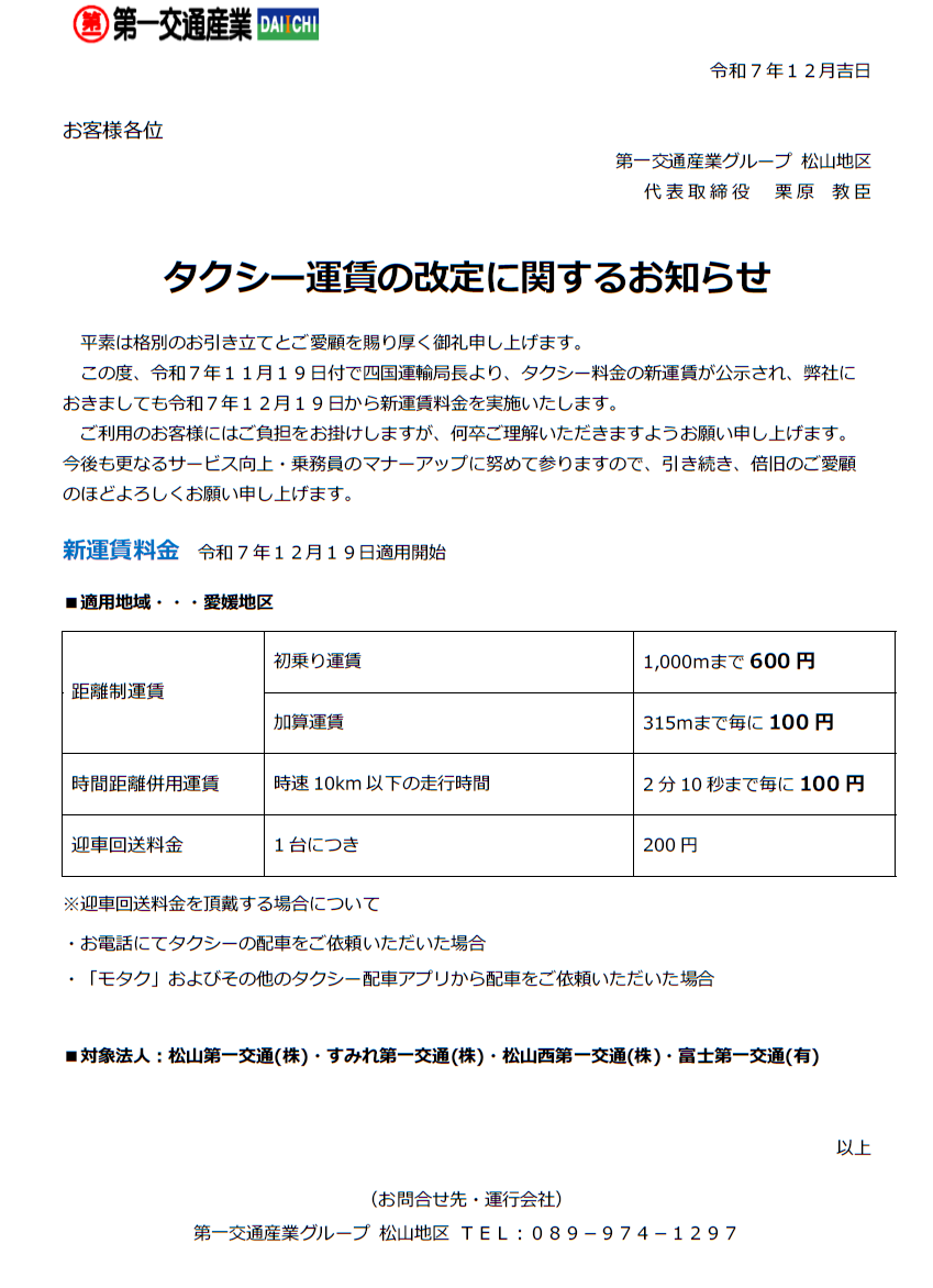 【愛媛エリア】タクシー運賃の改定に関するお知らせ