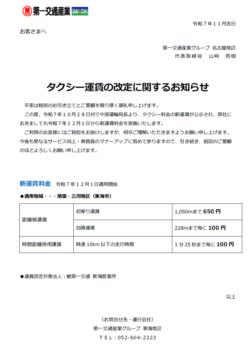 【東海エリア】タクシー運賃の改定に関するお知らせ