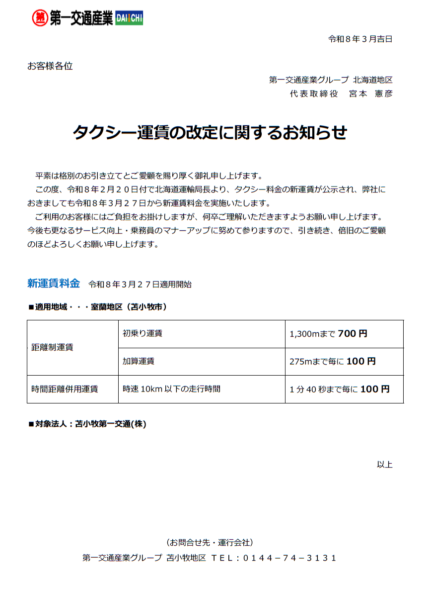 令和6年3月1日 お客様各位 第一交通産業グループ 札幌地区 札幌第一交通株式会社 興亜第一交通株式会社 北広島第一交通株式会社 代表取締役 西本 厚三 タクシー「迎⾞回送料⾦」導入のお知らせ 拝啓 時下ま […]
