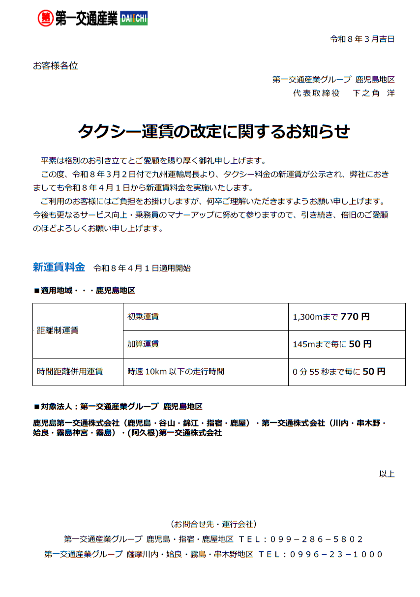 6月30日(月)に(川内)第一交通㈱霧島営業所の出発式を行いました! 7月1日(火)より営業を開始いたしておりますので、ご利用の際は下記配車番号までご連絡下さいませ。 【出発式の様子】 (川内)第一交通㈱ 霧島営業所 〇 […]